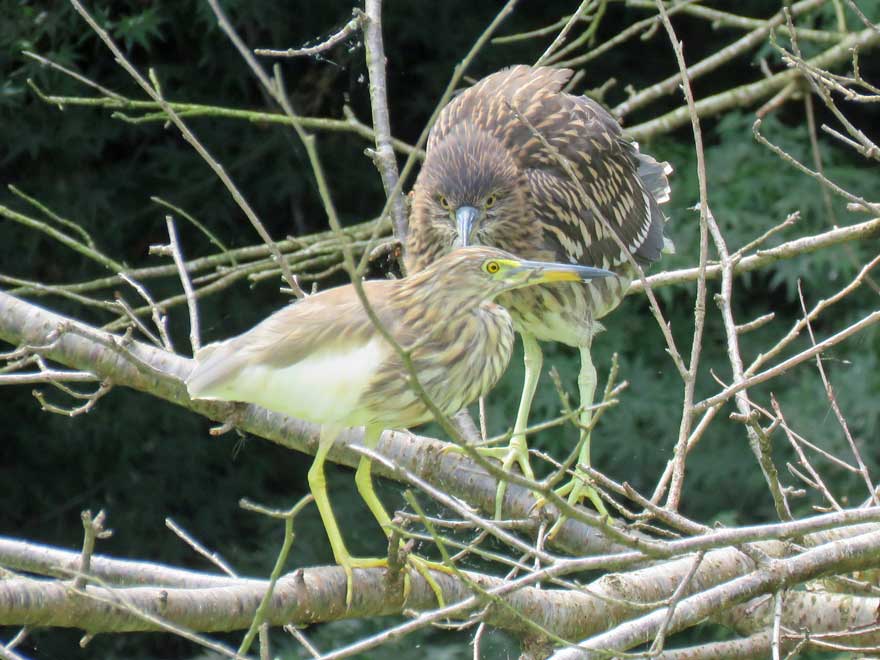 アカガシラサギの先にいるゴイサギ(幼鳥)が、激しく威嚇しています。