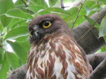 人間にとって最も身近なフクロウです。夜行性で昆虫類、小型の鳥類、小型哺乳類などを食べ、昼間は木の上で休んでいます。
