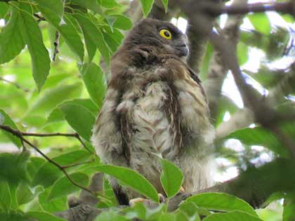 自然環境市民大学の講座で能勢の棚田を見に行きましたら、そこに大きな欅があり、アオバズクがいました。私たちが近づくと警戒して睨めつけられました。