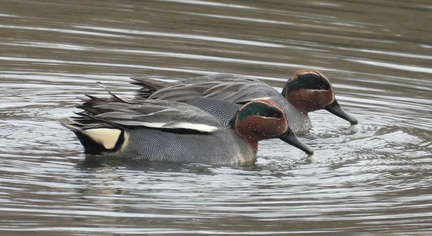 下記のコガモが激しく動きながら騒いでいました。求愛行動です。いつものヒーヒーに、全く別の鳴き声がが混ざっています。