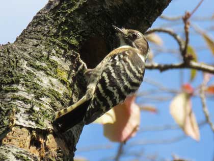 コゲラが巣穴を掘って、中に入って確かめているようでした。