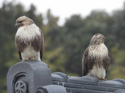 左側のノスリの方が胸が白いのでメス、右がオス。