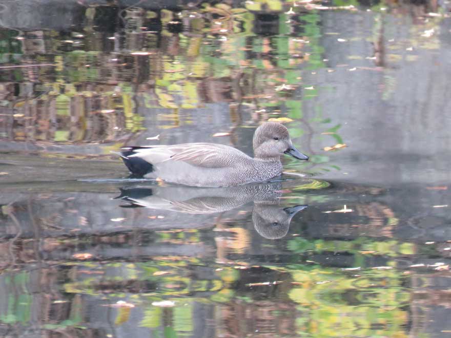 全体に灰色であるがヨシガモ同様に胸に縞模様がある。オスは上下尾筒(お尻)の黒が特徴。冬鳥。