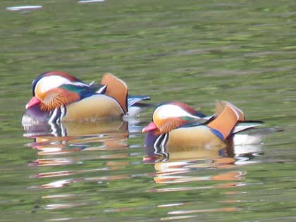 オシドリとマガモが重なっています。大きさの違いがよく分かります。(右)
